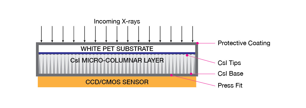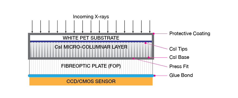 Scintacor produces an affordable alternative to FOP-based CsI scintillators, with a thin non-glass substrate replacing the Fibre Optic Faceplate.